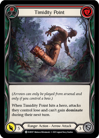 (Arrows can only be played from arsenal and only if you control a bow.) When Timidity Point hits a hero, attacks they control lose and can't gain dominate during their next turn.
